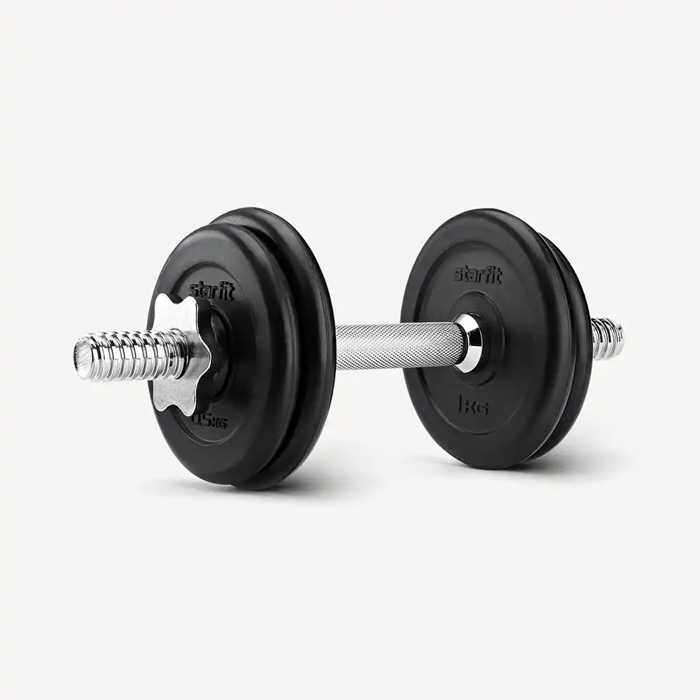 Состоит из хромированного металлического грифа с рифленой поверхностью и обрезиненных дисков, весом 0.5 и 1 кг. Надежные металлические замки с прорезиненной вставкой, широкий шаг резьбы. Подходят для дома и зала