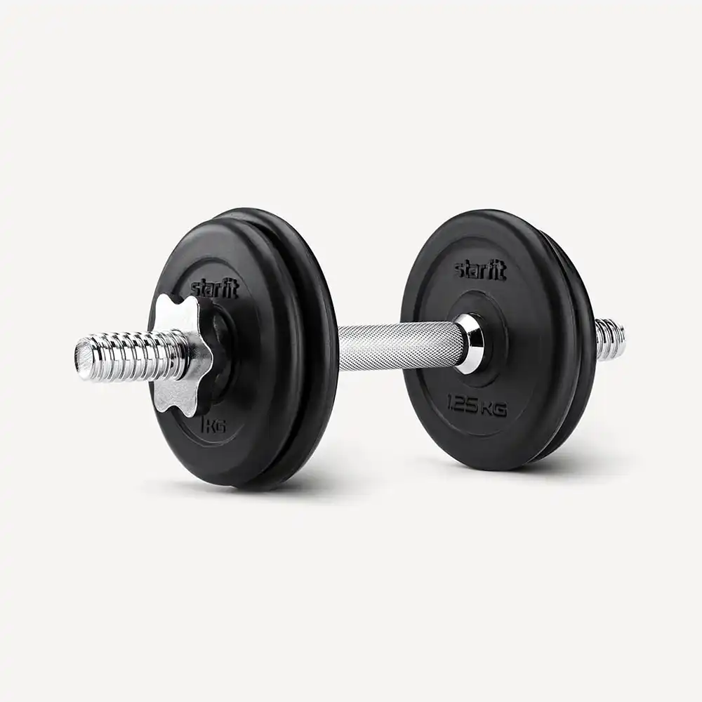 Состоит из хромированного металлического грифа с рифленой поверхностью и обрезиненных дисков, весом 1 и 1.25 кг. Надежные металлические замки с прорезиненной вставкой, широкий шаг резьбы. Подходят для дома и зала