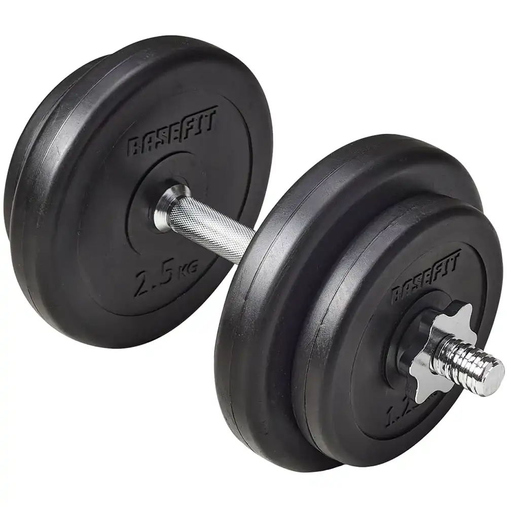 Состоит из стального грифа и дисков весом 1.25 и 2.5 кг, покрытых ABS пластиком. Наполнитель дисков - цемент. Надежные металлические замки, рифленый гриф, широкий шаг резьбы. Подходит для дома и зала