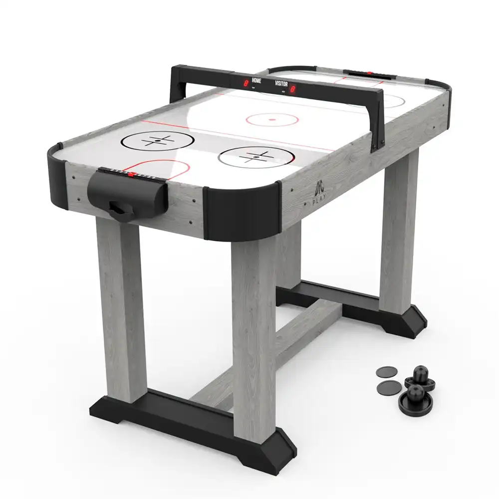 Данный игровой стол выгодно дополнит интерьер. В комплект входят 2 биты диаметром 65 мм и 2 шайбы чёрного цвета диаметром 40 мм, а также стильный электронный счётчик очков. Стол работает от сети с напряжением 220 вольт