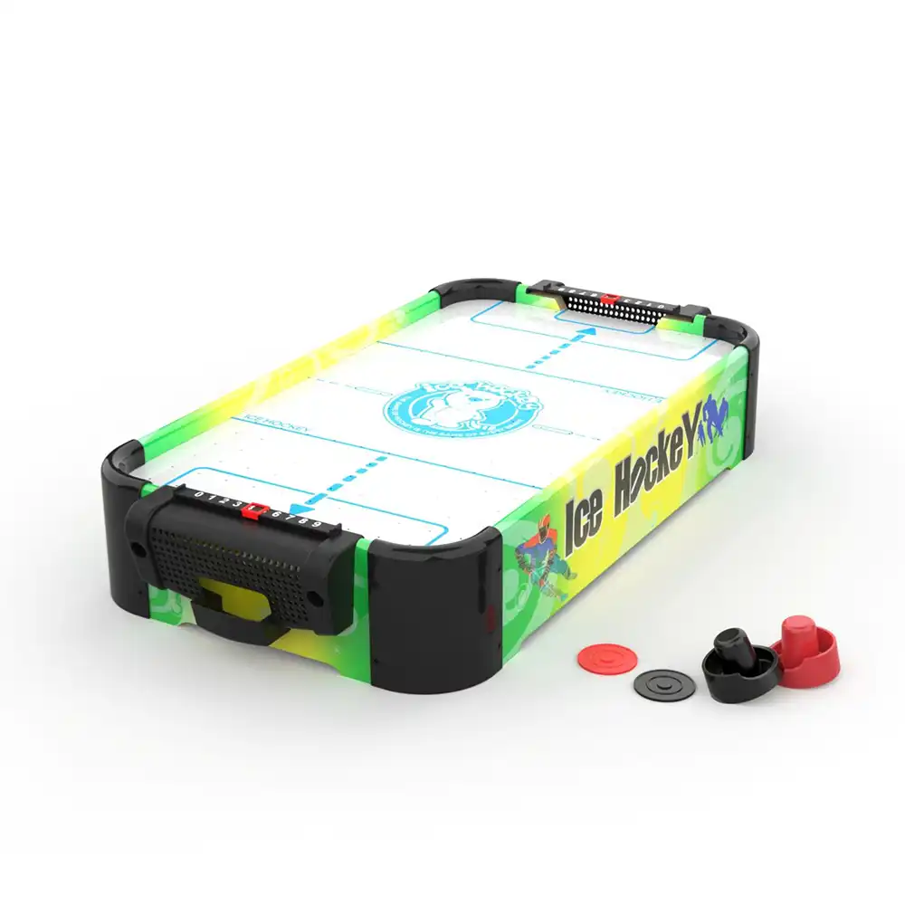 Яркий дизайн. Компактный, но прочный стол. Сделан из МДФ, покрытого ПВХ. В комплекте 2 биты диаметром 50 мм, 2 шайбы диаметром 40 мм, 2 механических счётчика. Вентилятор работает от 3-х батареек