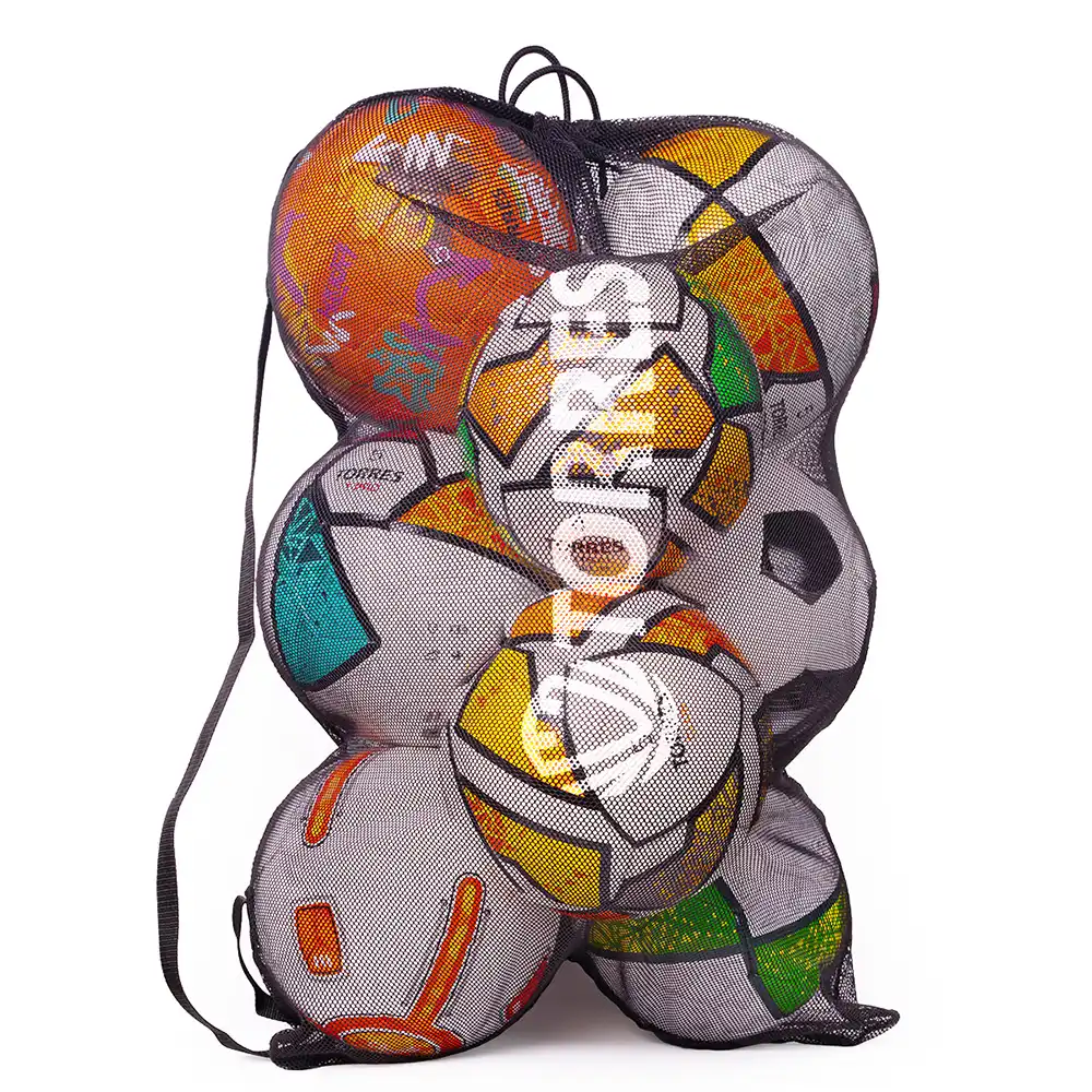 Сетка для мячей на шнурке с фиксатором, из сетчатого полиэстера. Для удобства транспортировки предусмотрен плечевой ремень. Вместимость до 10 футбольных/волейбольных мячей или 7 баскетбольных в зависимости от размера.
